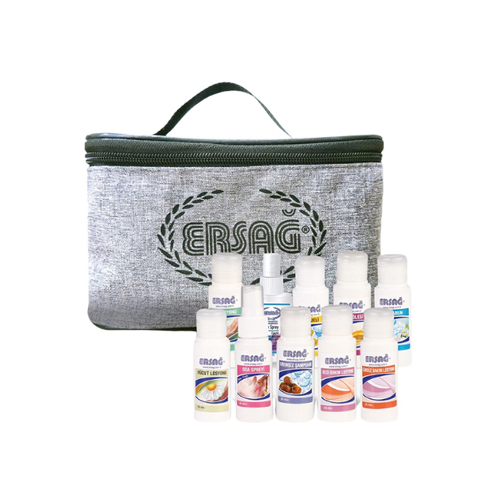 Дорожня сумка Ersag, вона ж – дуже містка косметичка. Зроблена з якісного міцного матеріалу, на ній є шкіряні вставки. Легко знайде місце у валізі, сумці, оскільки займає не багато місця. Але в ній знаходяться всі необхідні улюблені продукти Ерсаг в об'ємі 50 мл. Їх 10: